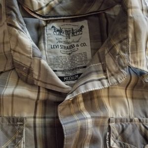 This is a Levi's western style button down shirt with pearl snap buttons. Design is plaid but shirt is light weight and short sleeve. Size is Medium and Original price over $40.