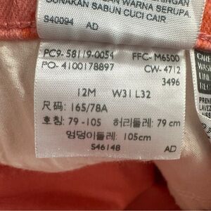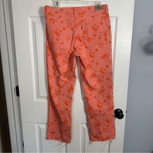 Levi's Perfectly Slimming 512 Straight Leg jeans, size 12. Pink with orange floral pattern, hems have been let down, leaving a raw edge.