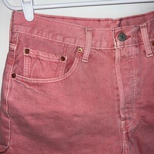 These Levi’s 501 Original Denim Shorts in a soft pink wash bring a fun, feminine twist to a classic style. Featuring the iconic high-rise fit, button fly, and raw hem, they offer a vintage-inspired, relaxed look perfect for warm-weather days. Made from durable, non-stretch denim, they provide a structured yet comfortable fit that molds to your shape over time.
