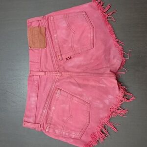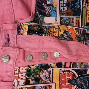 Vibrant pink jean shorts with Star Wars comic print. Frayed hem. Unique and stylish.