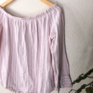 An off the shoulder pink and white linen top! Elastic on the front and buttons down the back of the shirt. Buttons on the ends of sleeves to roll them up or keep them down!