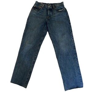 The product is a pair of Levi's Premium 501 '81 Jeans in size 28x28, straight leg fit with a button fly closure. These denim jeans feature a raw hem, 5-pocket design, and are made from comfortable cotton fabric. With a medium wash and solid color, these iconic Levi's jeans are perfect for wearing in the summer, fall, and spring seasons. The classic design and high rise make them a versatile staple for any wardrobe, ideal for those looking for a timeless piece with a touch of 90s nostalgia.