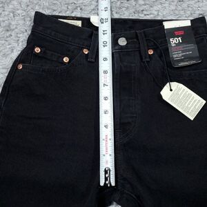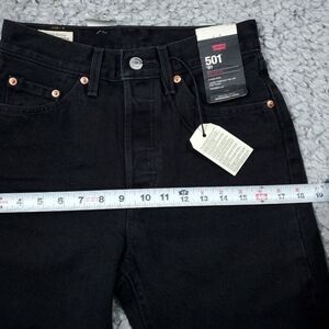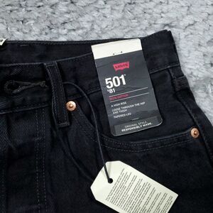 Levi's Premium 501 81 high rise tapered mom jeans in black. Ripped, distressed, or destroyed busted knee. Super high rise with tapered leg. 100% cotton nonstretch denim. Style number a46990012. Women's size 25 x 31, real measurements shown in photos with jeans laid flat: