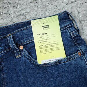 Men's Levi's Premium 511 Slim Flex stretch denim in medium to dark wash blue "Better Friends". Style number 045115945. New with tags. 28% Lyocell (Lenzing TENCEL™ Lyocell), 2% LYCRA®®, 70% Cotton. Men's size 36x32, real measurements shown in photo with jeans laid flat: