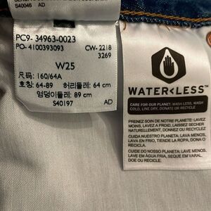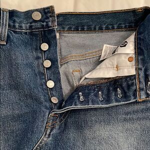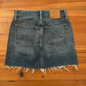 Premium denim, 100% cotton, blue jean mini skirt by Levi's in a women's size W25. Button fly closure. Raw hem. Leather patch on back hip. 5-Pocket design. machine washable. Approximate measurements shown in photos. In excellent pre-owned condition with little to no signs of wear.