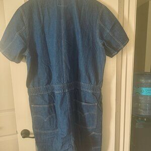 Timeless Levi Strauss & Co. Premium denim shortall crafted from 100% cotton in a classic dark wash. Features a full button-front closure, short sleeves, and contrast stitching for that authentic Levi’s look. Designed with utility-style chest pockets, side and back patch pockets, and an elastic waistband for a comfortable, flattering fit.