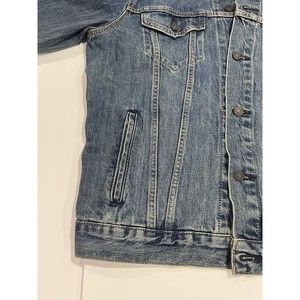 This jacket comes in size Large and has a blue color with a Levi's logo on the back. It is fully lined with cotton and made from denim fabric. With pockets and a regular fit, this jacket is perfect for anyone looking for a comfortable and stylish jacket. It is suitable for all seasons and can be used for walking, cycling, baseball, cross-training, dance, CrossFit, basketball, bodybuilding, and more.