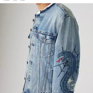 Levis Premium Mens Trucker Jean Jacket Embroidery Snake Always Got You Sizes M and XL. NEW WITH TAGS!
