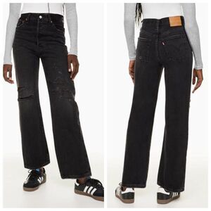 These Levi’s Premium Ribcage jeans feature a super high rise and destructed straight-leg ankle silhouette, crafted with stretch denim for a flattering fit.