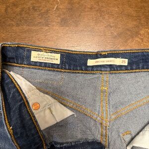 Only worn once. Too small for me. Levi’s Premium Ribcage shorts size 25. Frayed hem and light distressing. High rise and slim through him and thigh. Please reference Levi’s for official size measurements.