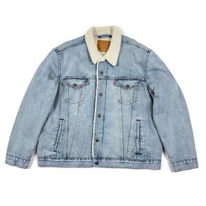 About item: Levi’s Premium Sherpa Trucker Jean Jacket | Men’s XL | Light Wash Blue | 100% Cotton, Faux Fur Lining: 100% Polyester | Snap Closure