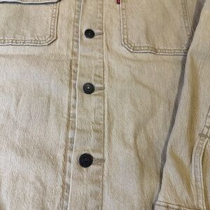 Classic Levi's denim jacket. Features button-front closure. Dual chest pockets for style and function. Beige color for versatile wear.