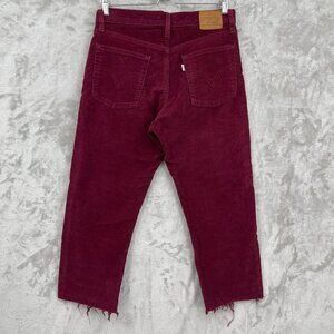 Levi's Premium Wedgie Straight cropped corduroy jeans in burgundy/ wine/ dark red. High rise cut, button fly closure. Raw hems. Thick leather embossed logo patch at rear waistband, white tab at rear pocket. Material is a cotton blend with a little stretch. Size 29. Please see photos for measurements.