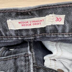 Pre-owned, Levi’s Premium Wedgie Straight Cropped Raw Hem High Rise Button Fly in vintage black grey wash size 30. No major marks stains holes or flaws. usual signs of wash and wear, seams around the crotch and thigh slightly weathered but no holes (shown in pictures). Great used condition with a lovely denim patina to these jeans. Washed on gentle cold and tumble dried on low through use.