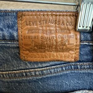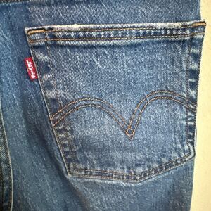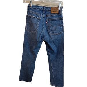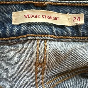 The product is a pair of Levi's Premium Wedgie Straight High Rise Blue Jeans in women's size 24. Made from 100% cotton with a medium dark fabric wash, these solid blue jeans feature a button closure and a mid-rise fit. The Wedgie Straight style offers a flattering and comfortable silhouette, making them a versatile and stylish addition to any woman's wardrobe. Ideal for everyday wear, these cropped jeans can be dressed up or down for any occasion.
