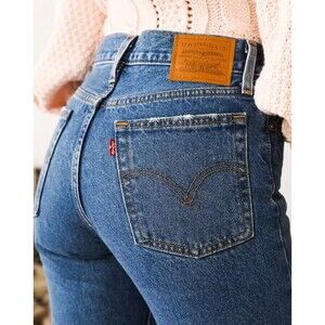 Levis Premium Womens Wedgie Straight Denim Jeans Dark Blue High Rise Button Fly