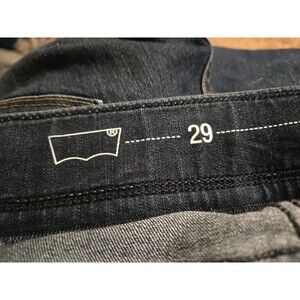 The product is a pair of Levi's pull-on skinny jeans in a dark wash stretch denim, featuring a high-rise design. These jeans are in size 29 with a slim fit, and are perfect for all seasons. They have an elastic waist for comfort and shaping, and a 5-pocket design with back pockets. The dark wash denim, combined with the Levi's logo accents, gives these jeans a stylish rock and 90s-inspired look. Made from a cotton blend material, these machine washable jeans are a versatile and trendy addition to any woman's wardrobe.