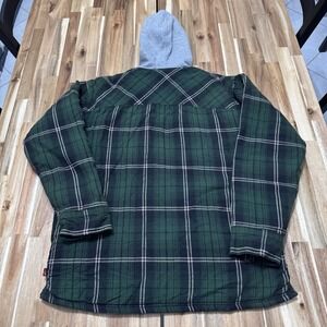 Levis Quilted Lined Shirt Jacket Mens M Green Plaid Hooded Snap Button Shacket