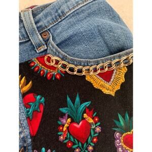 Tags: Levi’s, denim, shorts, jean, reworked, custom, hearts, gold chains, high rise, cut off, raw hem, one of a kind, rare, cute, summer, vacation, Levi’s Re plus denim shorts medium 10 high rise cut off re done