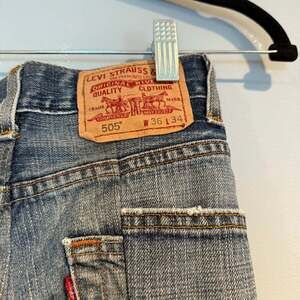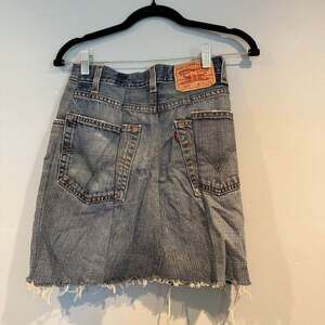 Recrafted Levi's 505 denim mini skirt in a medium wash. This unique piece features a raw, distressed hem and visible original seam lines, adding to its authentic, upcycled appeal. The skirt is made from actual Levi's 505 jeans, giving it a comfortable regular fit. It's perfect for a casual, streetwear look.