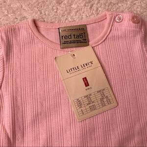 Levi’s Red Tab Onsie and Skirt Set. Brand new w tags, never worn. Has pink onsie w navy skirt that has shorts underneath. Has faux ties in front.