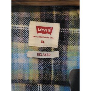 Levis Relaxed Fit Heavy Flannel Shirt is a versatile piece in black, green, and yellow plaid. Its XL size and long sleeves make it perfect for cooler seasons.