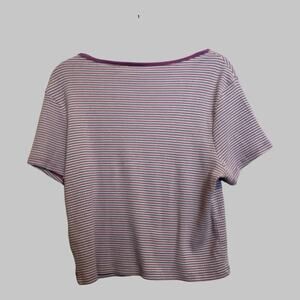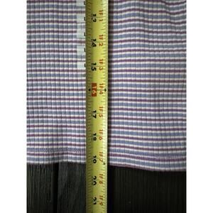 The Levi’s Retro Women’s Britt Snap Short Sleeve Ribbed Purple Blue Crop Top in size L is a stylish and versatile addition to any wardrobe. This cropped top features a round neckline with snap closures, making it perfect for casual occasions in the summer, fall, and spring seasons. Made from comfortable cotton knit fabric and accented with a striped pattern, this top exudes a retro 90s vibe with a touch of throwback style. The Levi's brand ensures quality and a regular fit for a flattering look.
