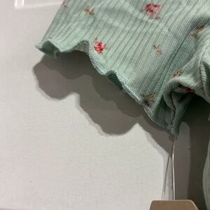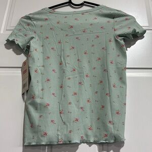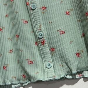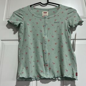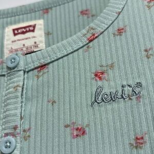 Levi’s Rib Knit crewneck,lettuce ruffle sleeve, stretch, button detail, floral