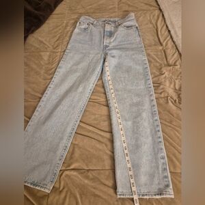 Classic light blue button-fly Levi's Ribcage straight jeans with classic stitching. Created to slim the waist-line. No holes. They are sooooo chic!