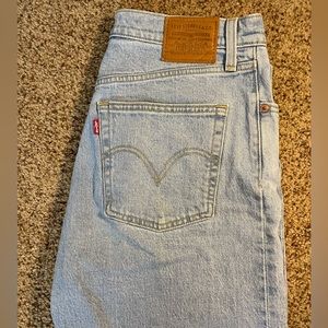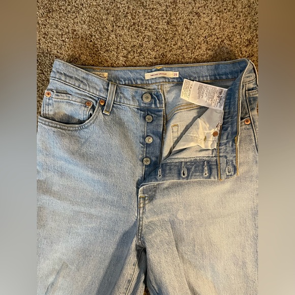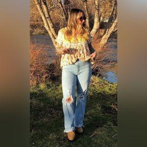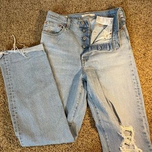 Full length, high waist, distressed at the knees, heavy duty, worn only once
