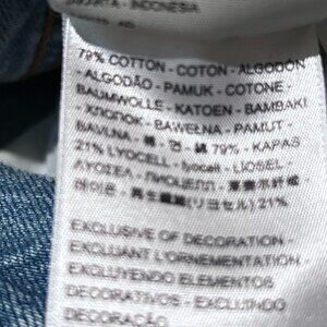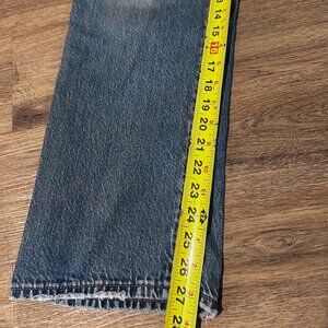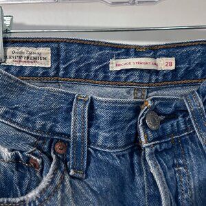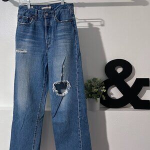 Levi ribcage straight ankle jean. Medium distressed, ripped denim. Button Closure.