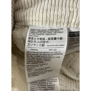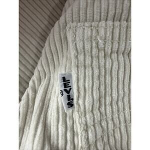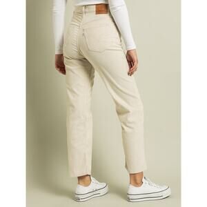 The product is a pair of Levi's Ribcage Straight Ankle Jeans in a corduroy fabric, featuring a solid beige color and button closure. These jeans have a high rise and a regular fit, with a waist size of 25 inches and an inseam of 25 inches. They are made from a cotton blend material with stretch for added comfort and flexibility. The jeans also come with pockets and a logo accent, making them a stylish and versatile choice for any season.