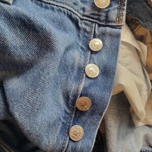 Levi's Ribcage Straight Ankle Jeans in a light wash with fading on thighs. Very good preowned condition, Size: 32/27