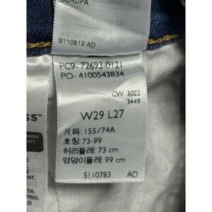 The Levi's Ribcage Straight Ankle Jeans for women in size 29 feature a super high rise waist with a dark wash denim fabric. The jeans have a solid pattern with accents like buttons, logos, and a 5-pocket design. This style is perfect for those looking for a vintage touch with a hint of hipster, retro, or bohemian flair. With a regular fit and comfortable stretch material, these jeans are machine washable and easy to care for, making them a versatile addition to any wardrobe.