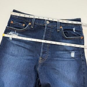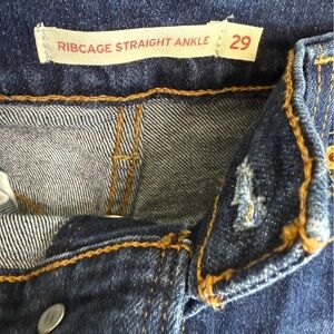 Levis Ribcage denim jeans, straight ankle length, high waist, classic pockets front and back,hidden buttons fly, moderate distressed details at the front. Excellent preowned condition gently used no flaws.