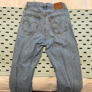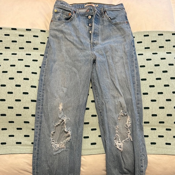 Distressed Levi’s in the perfect high rise fit! So flattering on! Lightly worn. I’m usually a 4 but these are a 6, so selling for that reason only!