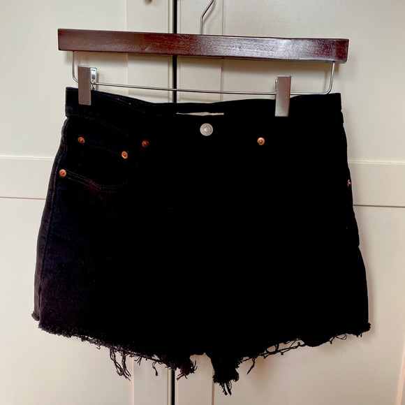 Size 28 shorts with distressed detailing at leg openings. Button front