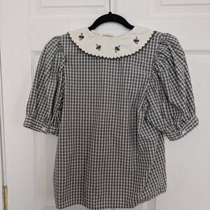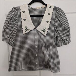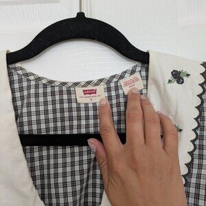Adorable Levi's blouse with a floral oversized collar. There is a small stain on the collar that may came out with dry cleaning. Open to offers!
