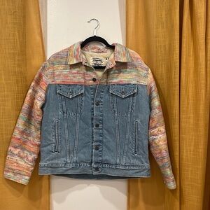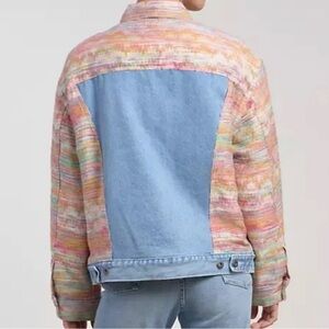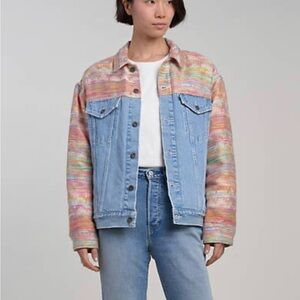 Malhia Kent. The jacquard's beautiful array of colors sleeves, yolk and back side panels contrasts nicely with the organic, medium blue denim that makes up the rest of the jacket. And to top it off, we added a sherpa lining for extra warmth.