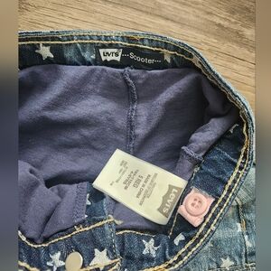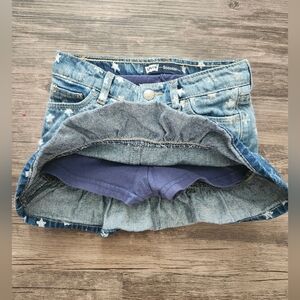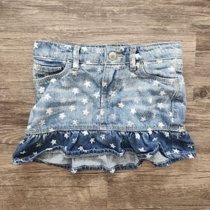 Levi's Scooter Patriotic Star Pattern Ruffle Denim Skort Skirt, great pre worn condition, size 5, adjustable waistband inside, lined with inner shorts, ruffle hemline, USA, 4th of July, 5 pocket design