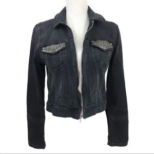 Levi's denim jacket, size M. Washed black in color. Zip front closure. Sequin detail on front pockets and back panels. Gently used condition - no flaws noted.