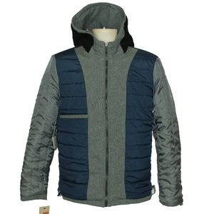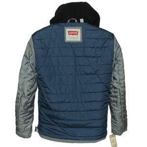 This men's Levi's sherpa lined bomber jacket is size small and NWT! The 100% polyester body is heather grey. The coat features a full zip front with red Levi's tab, 2 front zip pockets, a hood with sherpa lining and adjustable drawstring, an adjustable drawstring waist, an inside pocket, 100% polyester quilted lining, and 100% polyester filling.