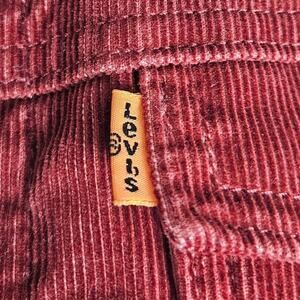Embrace a timeless retro look with this Levi's corduroy trucker jacket. Crafted from a rich rust-red corduroy and lined with a cozy cream sherpa fleece, this jacket is perfect for fall and winter. It features a classic snap-button closure, chest pockets, and side hand pockets for a functional and stylish fit.