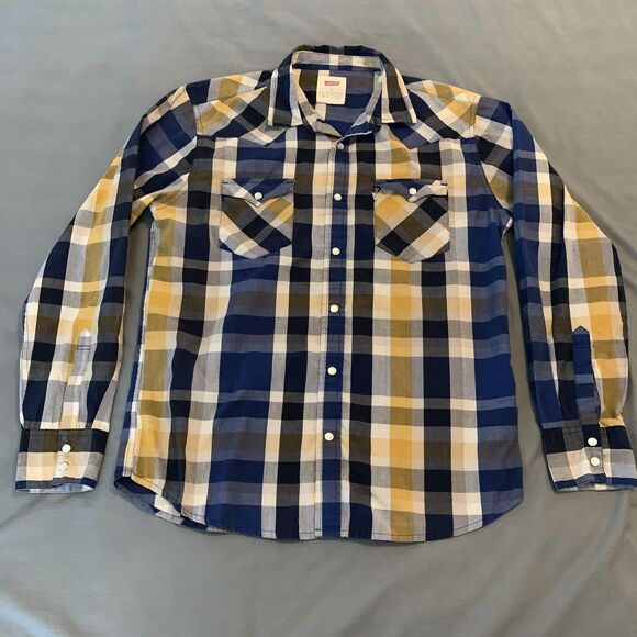 Levis Shirt Mens Medium Blue Yellow Plaid Snap Front Western Pearl Snap Casual