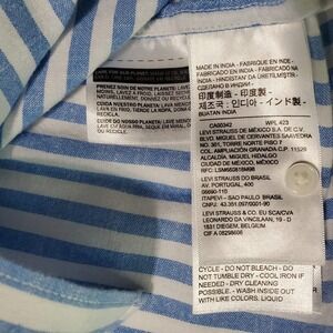 The product is a Levi's women's shirt in size M, made from a blue and white striped viscose blend material. This button-up shirt features a collared neckline, short casual sleeves, and is machine washable for easy care. With a regular fit and lightweight fabric, it is perfect for casual occasions during the summer, fall, and spring seasons. The colorful striped pattern adds a vibrant touch to the basic yet stylish design of this Levi's top.