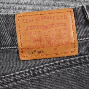 Levi’s Premium 501 ’90s button-fly jorts in a washed black/charcoal denim with long, raw frayed hems. Tagged W31 (approx women’s size 12) and rigid 100% cotton; PC9 A1962-0021. Color may vary slightly from photos due to lighting and monitor settings.