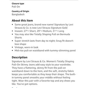 Pre-owned Levi Strauss & Co. Signature by Levi Strauss & Co. Women's Totally Shaping Pull-On Skinny Jeans in size 18M - W34 L30. Dark wash blue denim. Mid-rise pull-on waistband with tummy-slimming panel. Features a skinny fit and super stretch fabric. Made in Pakistan. Shows general wear consistent with pre-owned condition. No significant rips, stains, or tears are visible.