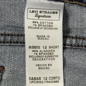 Elevate your denim game with these Levi's Signature Series boot cut jeans (short) in a light wash. These women's jeans feature a 5-pocket design, with a zip and button closure and a mid-rise fit measuring 11 inches. The fabric is a stretchy and breathable blend of spandex, cotton, and cotton blend, ensuring both comfort and flexibility.