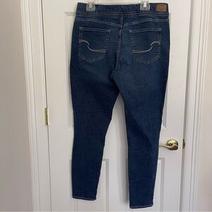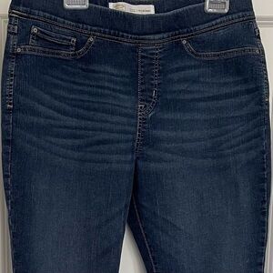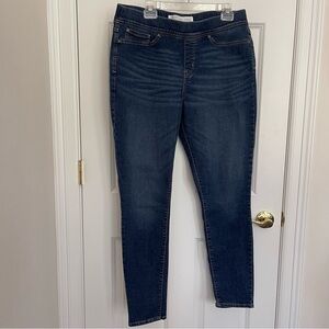 Levi’s Signature Totally Shaping pull-on skinny jeans. If you’re looking for a pair of skinny jeans that really hold you in and support you all over, these are it! Cotton/Polyester/Elastane blend offer the ultimate in support. Built in tummy control panel and faux front pockets and fly help to keep you smooth. Intentional fade distressing and intentional feathering distressing across hip area. Two functional back pockets. Style tag says 32” length, but these measure closer to 30” in length.