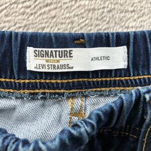 These Levi's Signature Gold Athletic Fit Jeans combine style and comfort. The elastic waistband ensures a snug fit, while the durable denim fabric withstands everyday adventures. With a classic blue hue, these jeans easily pair with various tops for versatile styling, making them a practical choice for an active wardrobe.